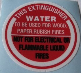 THIE EXTINGUISHER WATER.TO BE USED FOR WOOD, PAPER, RUBBISH FIRES. NOT FOR ELECTRICAL OR FLAMMABLE LIQUID FIRES.