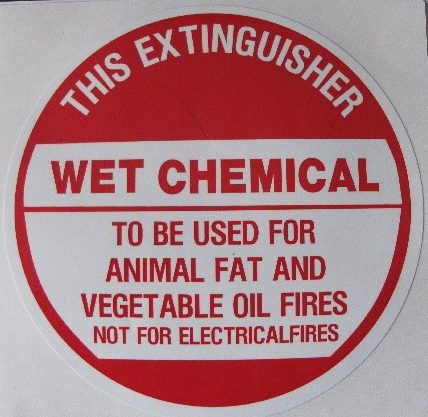 THIS EXTINGUISHER, WET CHEMICAL. TO BE USED FOR ANIMAL FAT AND VEGETABLE OIL FIRES. NOT FOR ELECTRICAL FIRES.